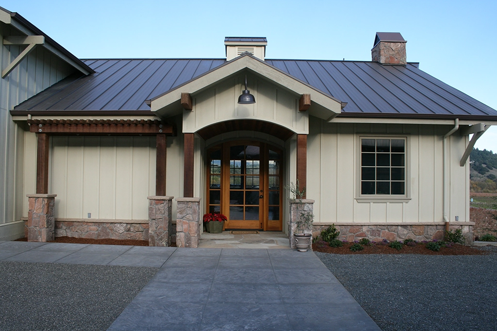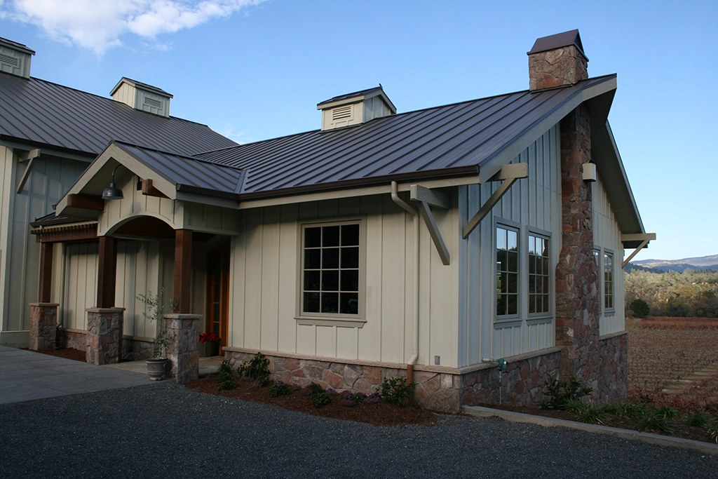Zichichi Winery incorporates Steelscape’s Black solid color finish to establish a bold, modern presence in the heart of Sonoma wine country. The deep, matte hue creates a strong visual anchor within the vineyard landscape and highlights the clean lines of the structure’s architectural form. Metal siding provides resilience against sun, wind, and seasonal temperature changes, crucial for agricultural facilities. The contrast between black metal and the surrounding greenery enhances the winery’s contemporary brand identity. The finished building is both durable and striking in appearance.