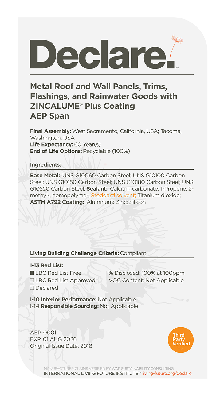 AEP Span’s portfolio of products in a ZINCALUME® Plus coating has been issued a third-party verified LBC Declare label and is Red List Free. LBC is made up of seven petals, of which AEP Span products in a ZINCALUME® Plus coating can contribute to the Material Petal – Imperative 13.